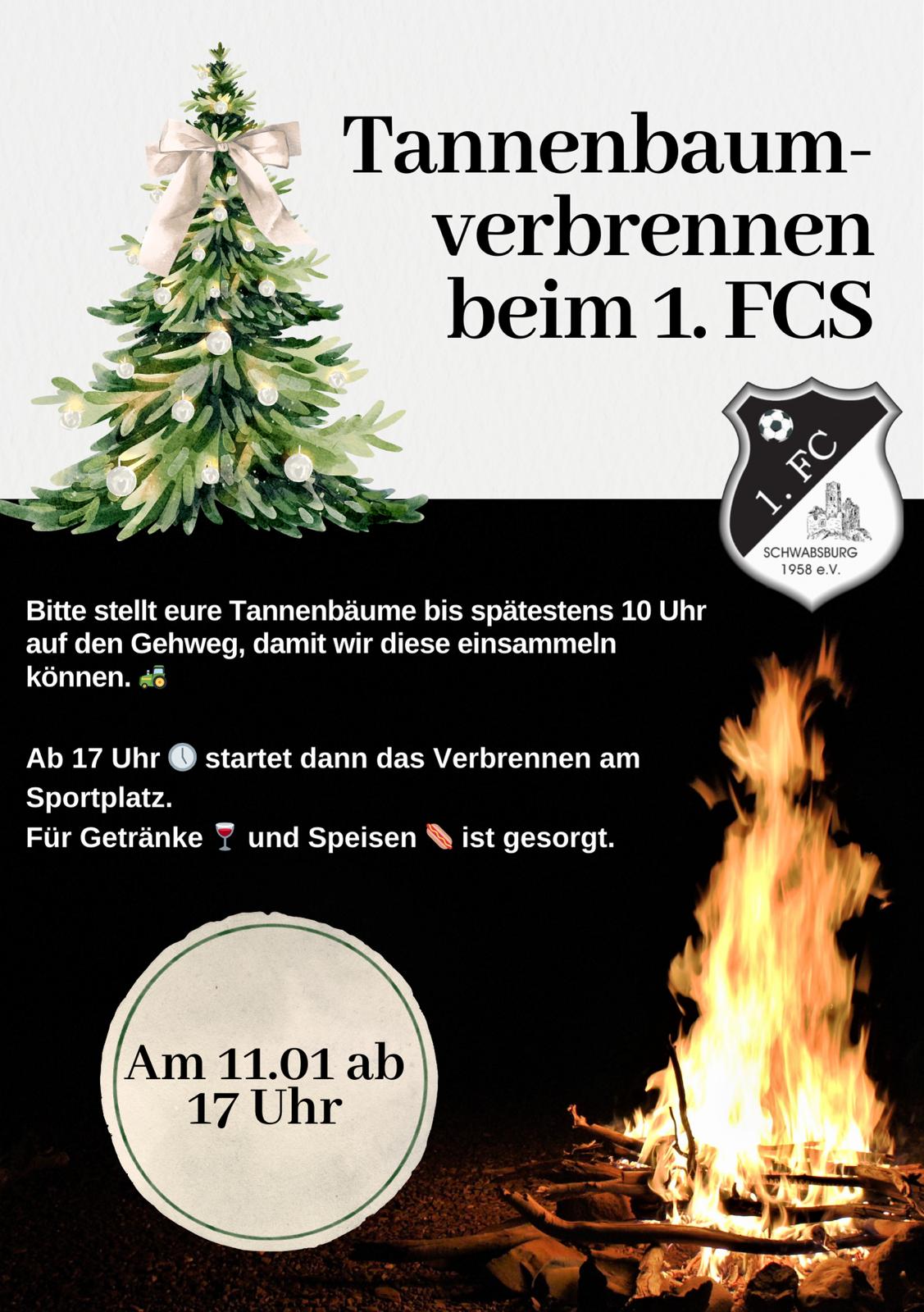 Dear Schwabsburgers on January 11 we will collect your Christmas trees for the traditional burning please have them on your doorstep by 10 a.m. We invite you to join us from 5 p.m. for food and drinks at the club. We hope you had a peaceful Christmas and wish you a great start to 2025. We look forward to seeing you Your 1st FC Schwabsburg 1958 e.V.